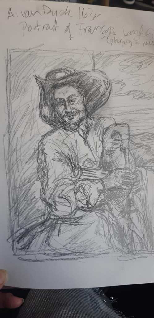 There are a few other artists who come along to join for a coffee and chat and then go off to continue drawing on their own, as well as others who seem to sketch in the cafe regularly. Now, during the lockdown, we are making use of the gallery’s extensive online catalogue while we are working from home, which at least allows for more diversity in materials. Occasionally Mark or whoever is leading the session will urge the group to focus on a particular theme or technique — as in a recent online National Gallery session, where the focus was on capturing spring light as it was reflected on a figure and landscape.