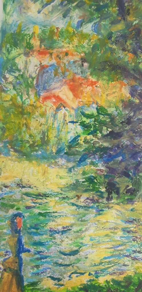 Although I struggled with the particular problems of working with a variety of soft/hard and chalk-/oil-based pastels on plain mixed-media paper (I was advised later by another artist in the group that I should have used a special pastel paper, since it absorbs and smooths the colours better), the two hours I spent trying to replicate Seurat’s Morning Walk were nevertheless a joyously glorious — if deeply messy — challenge.