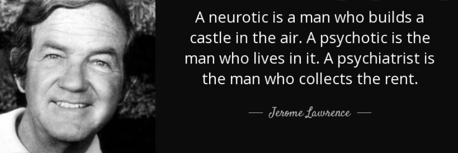 You may have heard the ‘joke’ version of some of these distinctions in Jerome Lawrence’s quote as: “A neurotic is a man who builds a castle in the air; a psychotic is a man who lives in it; and a psychiatrist is a man who collects the rent.” While we all know someone who we would describe as “neurotic” because they are constantly worried about things – often to an abnormal, seemingly ridiculous or unwarranted degree – a neurotic is someone who has a permanent inclination towards unreality, which is in fact a form of psychosis.