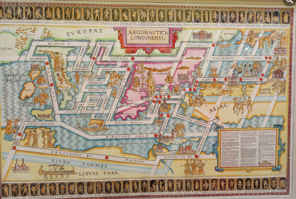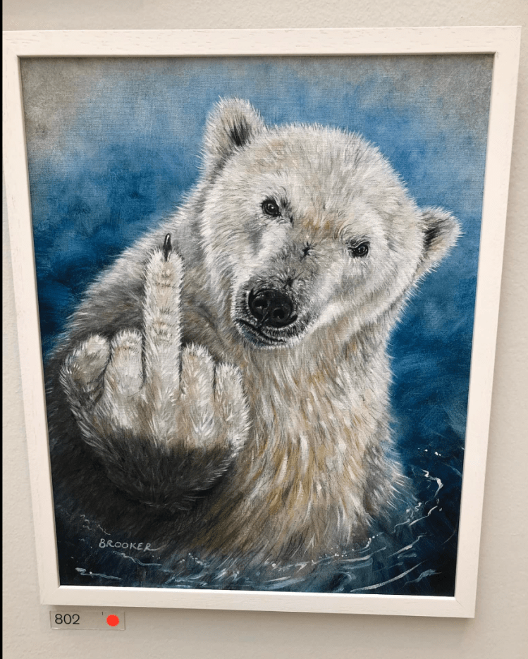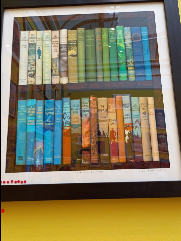 I later posted 80 photos, inviting friends to guess the theme. Most suggested death, decay or consumerism, despite ‘obvious’ inclusions – Sheila Rodge’s painting of a forest fire (Inferno); a print showing cracked, dry earth (Waiting for Rain by Linda Britt); Anna Heringer’s textile evoking drowned habitations, Rivers of Bangladesh; a still life of dead sunflowers with an exotic parrot (Watershed Moment by Emma Bass); Adam Dant’s London streets overlaying an antique map of the Mediterranean (Argonautica Londinensi); Phil Shaw’s weather-themed books (Climate Change); Scott Brooker’s Thanks, Man! painting of a polar bear flipping the bird; three black-and-white photographs of a disappearing stream (Impermanence Triptych by Annalisa Burrello); and Robin Smart’s retro TV collage of an imploding Earth overlaid with Disney’s cartoon logo, “That’s all folks!” (Fin).