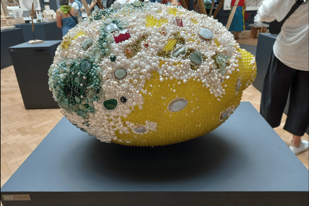 Most were surprised to hear the theme; they simply relished the diverse swirls of colour, with many attracted to the cover image – a vibrant yellow lemon studded with beads and costume jewellery depicting spreading mould (Bad Lemon (Josh) by Kathleen Ryan). As only a quarter referenced climate change specifically, perhaps Grayson Perry’s flippant intro sums it up: “Oh, and there are several works about climate change too.”