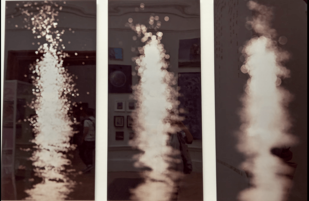 - (Clockwise, L–R): Sheila Rodge, Inferno; 2. Linda Britt, Waiting for Rain; 3. Anna Heringer, Rivers of Bangladesh; 4. Emma Bass, Watershed Moment; 5. Adam Dant, Argonautica Londonensi; 6. Phil Shaw, Climate Change; 7. Scott Brooker, Thanks, Man!; 8. Annalisa Burrello, Impermanence Triptych; 9. Robin Smart, Fin; 10.–12. Val and other visitors taking in the exhibition, some critically, some less so – the young African-American I spoke with (pictured) commented that as a snapshot of contemporary society, it did connect our self-obsessed consumer lifestyles with the existential threats we now face; she recommended I review the Plastic in Pots installation as a reference; 13. Stephen Chambers, Midas Tree; 14. Val protesting in front of Gary Hume’s Swans; 15. (top) Ying Tang, Untitled; (sadly no info available on artist for bottom photo)*
