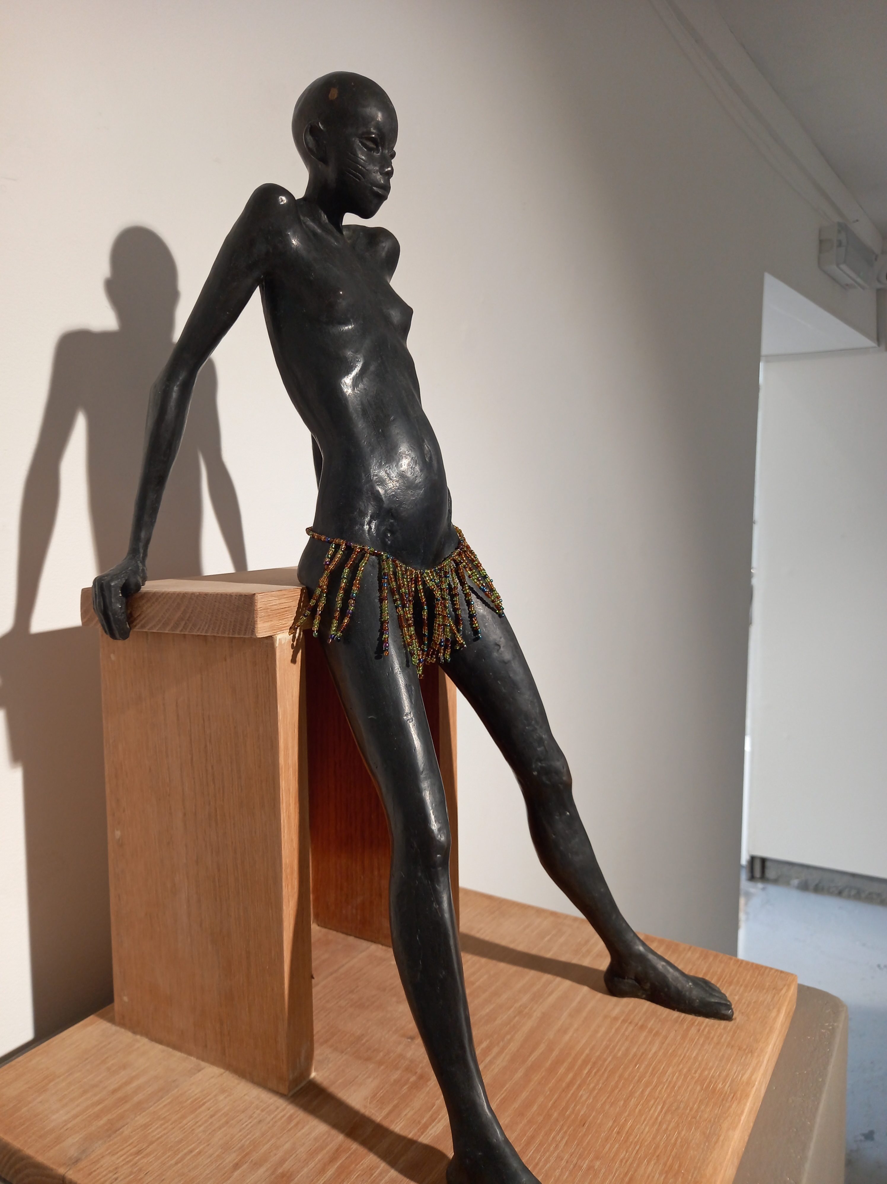The positioning and funerary black of the canvas form a counterpoint to his bronze sculpture Salome – a young African woman leans back in a reflective pose, as if pondering the beginnings of human existence.