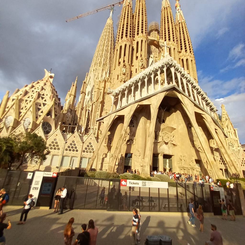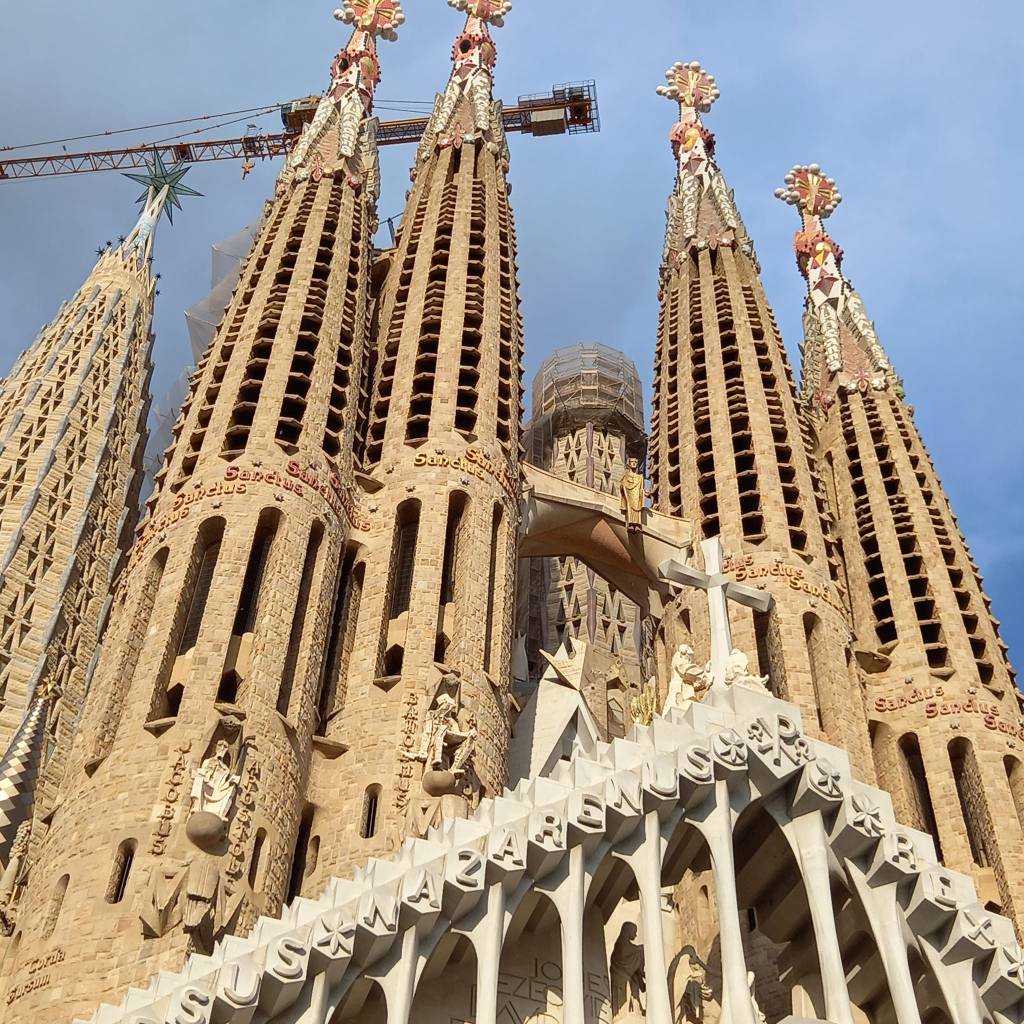 Although we didn’t go in to check out the beautiful, Gaudí-esque Art Nouveau interior, we enjoyed viewing its uniquely designed exterior over lunch, then taking in views of his famous church, Sagrada Familia, shown below (I had visited it in a previous art trip to Barcelona, so regrettably didn’t choose to revisit it on this trip – but at least it was no longer covered in scaffolding as it had been on that trip, only a noticeable crane on top).
