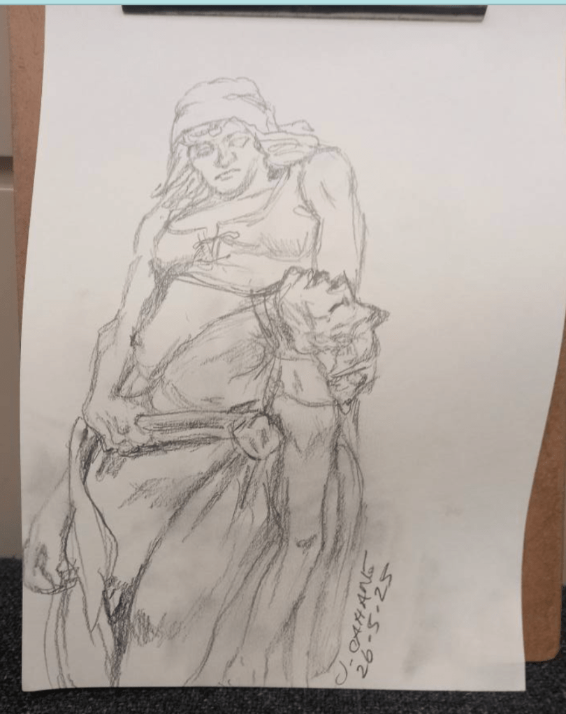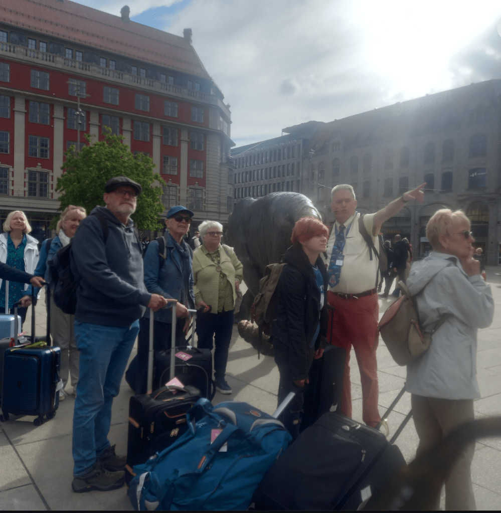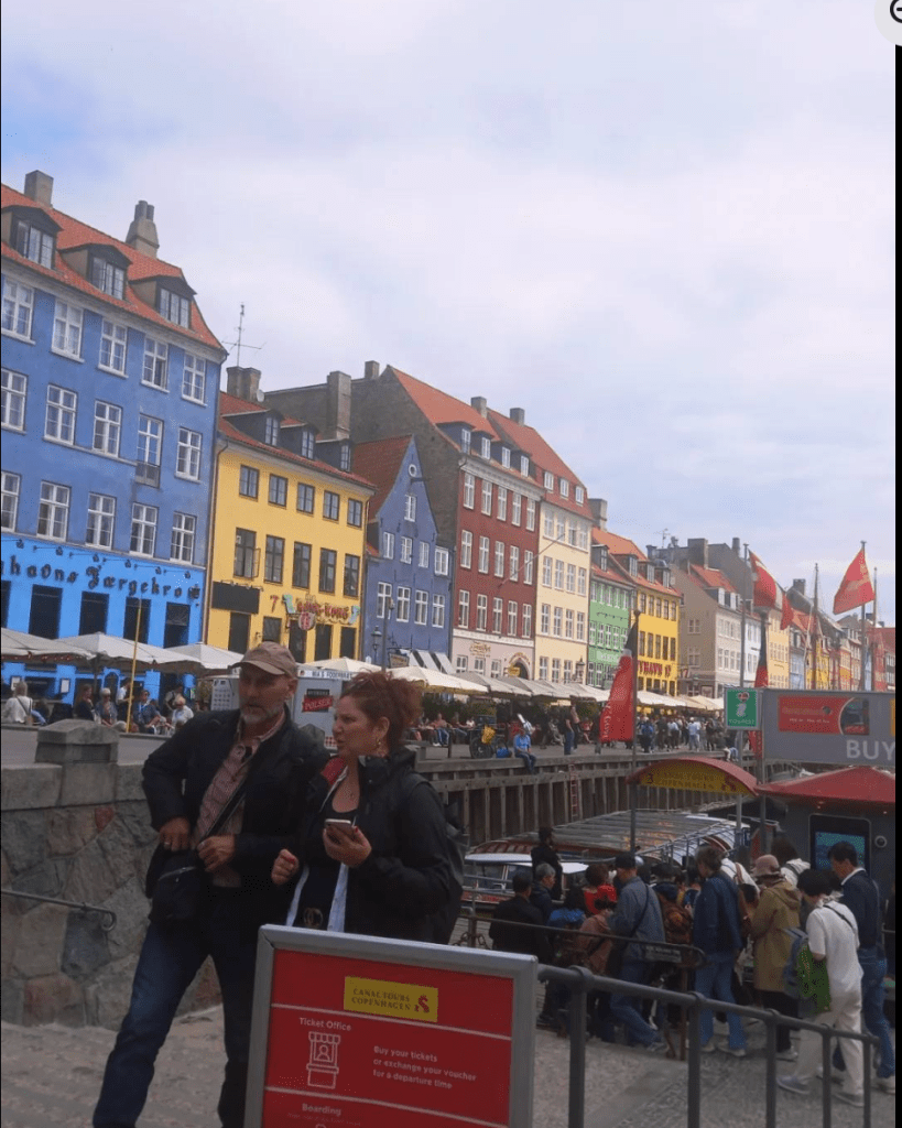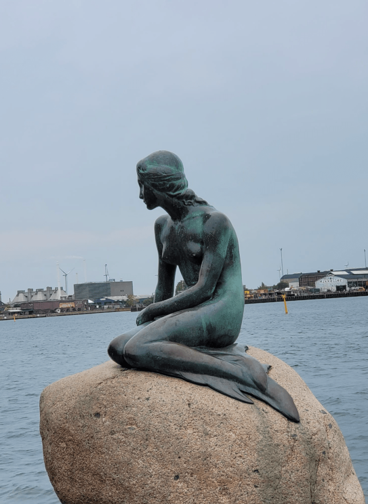 Although most of my fellow travellers were couples in the retired or 40+ age range, there was one other solo female traveller, like me quite independent and well-travelled, and one younger girl (Jess) travelling with her nan, who was quite funky and interesting (note: some of her pics shared on Whatsapp ended up in my gallery; I know it is her Little Mermaid statue pic I have used but am unsure of the others, which should rightly be credited to her). While I’d hoped to sketch several of my fellow travellers, she was the only one capable of sitting still long enough to get a decent likeness, despite having ADHD. I was also grateful to her and a few other older women for kindly offering to carry some of my things, as it was at times a trial having to lug all the layers I invariably needed to peel off to keep up with the pace of train platform changes, etc.