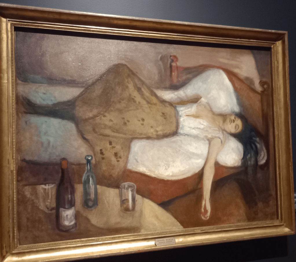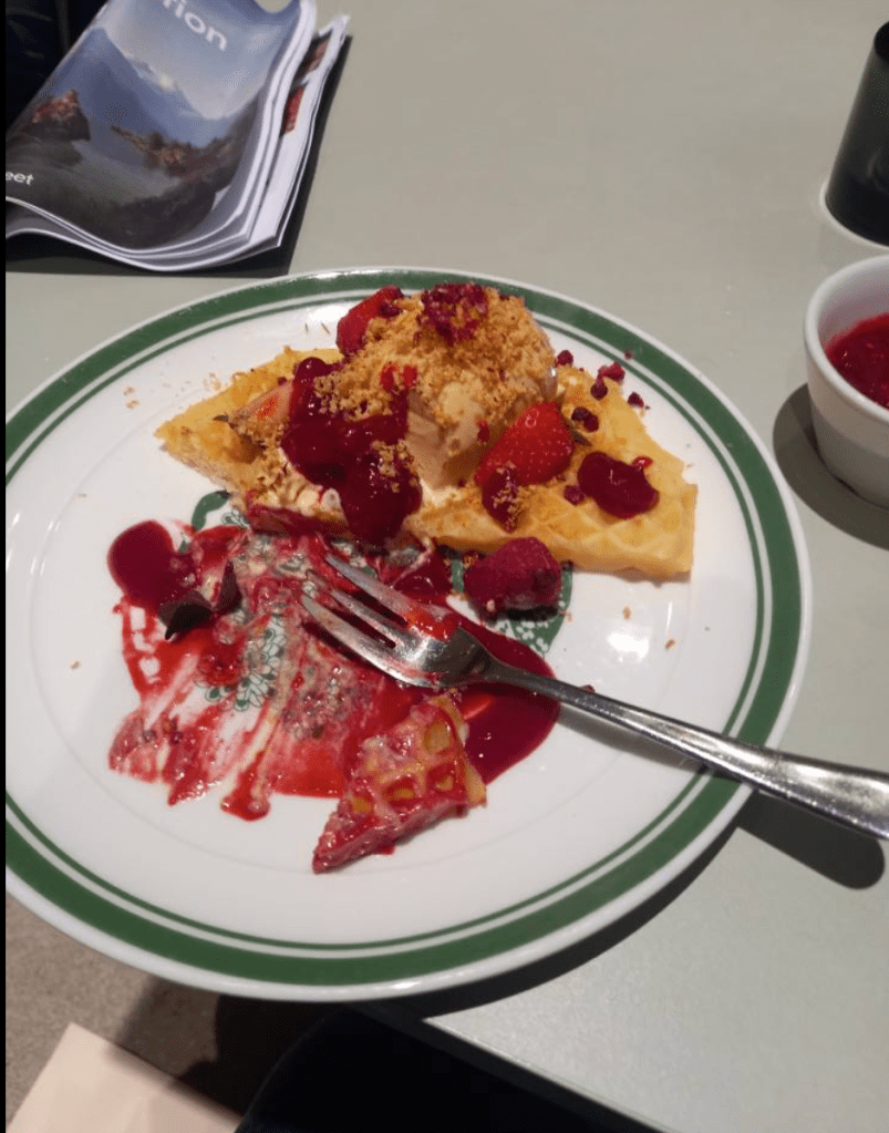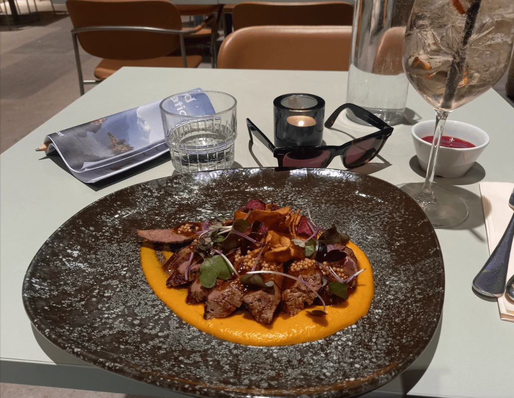 I would have liked to visit the Viking Ship Museum on Oslo’s Bygdøy peninsula, which was sadly closed; however, I did manage a brief stroll along the harbour to take in the scenery of its fjords and visit its newest arts and culture centre plus sauna, SALT, to enjoy its entertaining live-music scene. And although I had intended to go to the state-of-the-art Munch Museum with its 13 floors and 11 gallery spaces devoted to Norway’s most famous artist, after so much walking in the rain, I was happy to stay inside the warm National Museum, which had a great selection of Edvard Munch’s most famous paintings (including one of the versions of ‘The Scream’) in addition to historical artefacts and costumes over millennia. After sketching and examining the exhibits for a few hours, I enjoyed a wonderful dish of grilled reindeer on puréed carrot with root vegetable crisps, a marvellous GF ‘brown cheese ice cream’ and raspberry waffle and two knock-out elderflower spritzes in the museum restaurant.