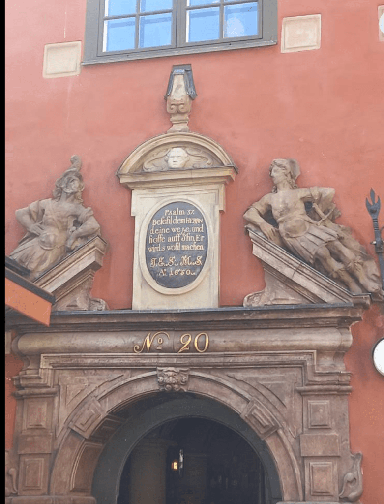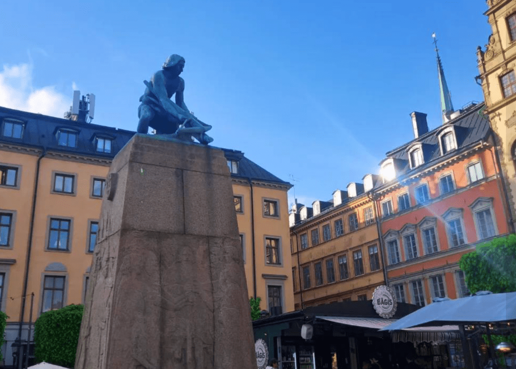 The next day (Thursday) we went first for a guided tour of the city with a local Swedish woman who took us through the train station to point out some of its artworks and recommended nearby restaurants before heading across different bridges to return to Gamla Stan. After wandering around listening to her explain the city’s history as she pointed out its impressive Royal Palace, its beautiful, pastel-hued Storkyrkan (Stockholm) Cathedral, various statues, 16th and 17th century buildings and many colourful shops along its maze of narrow, cobbled alleys, I opted to take a break outside a charming café (Grillska Huset, dating back to 1649) in its main square, Stortorget, where the Nobel Prize Museum is located, to sketch its famous well and a few of its colourful buildings. I also bought some colourful souvenirs from shops selling handcrafted Swedish wooden horses, apparently the country’s national symbol.