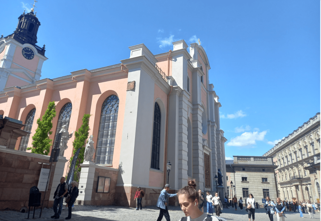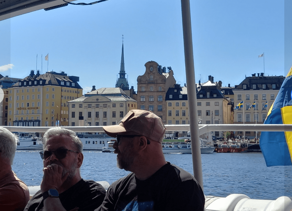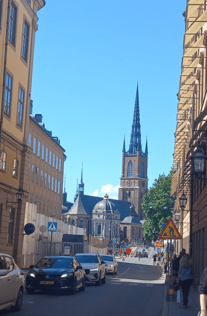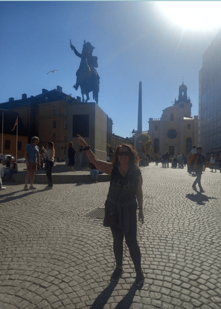 It was a beautiful, warm, sunny day as we journeyed through Sweden’s densely forested and lake-studded countryside – it is almost entirely flat, in contrast to Norway – via coach to the quaint railway station in Kristinehamn and then via high-speed rail to Stockholm’s busy central rail station. By the time we arrived and got settled into our hotel (Hotel C, conveniently near the station and other forms of transport – trams, buses, canal boats, metro, rail), I couldn’t wait to change into lighter summer clothes to head out for a brief coach + walking tour of the original Mediaeval settlement. Known as the Old Town (Gamla Stan), it is set on its own island (the city of Stockholm is actually a network of 14 islands, all connected by some 57 bridges). There we had an introductory 3-course group meal including meatballs, lingonberries, mashed potatoes and pickled cucumber, followed by a pudding – infinitely better than the Ikea version!