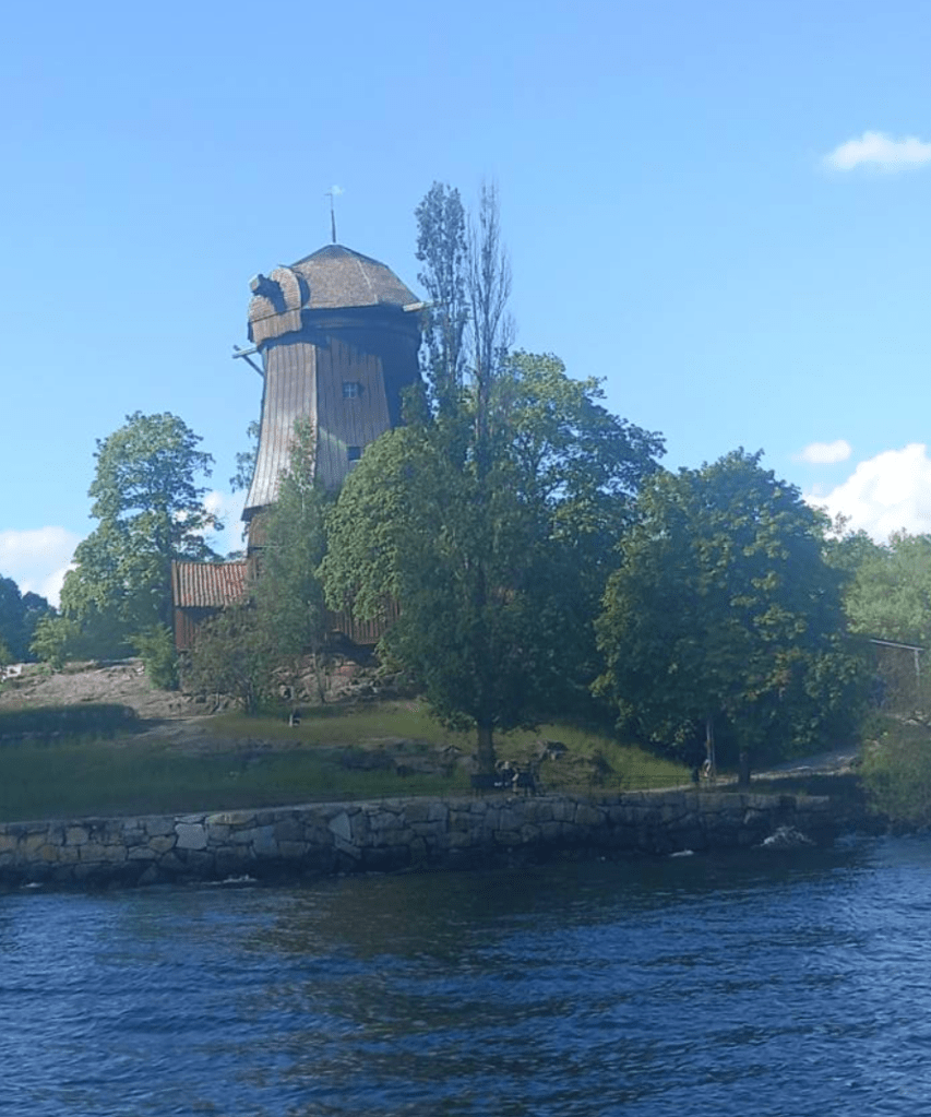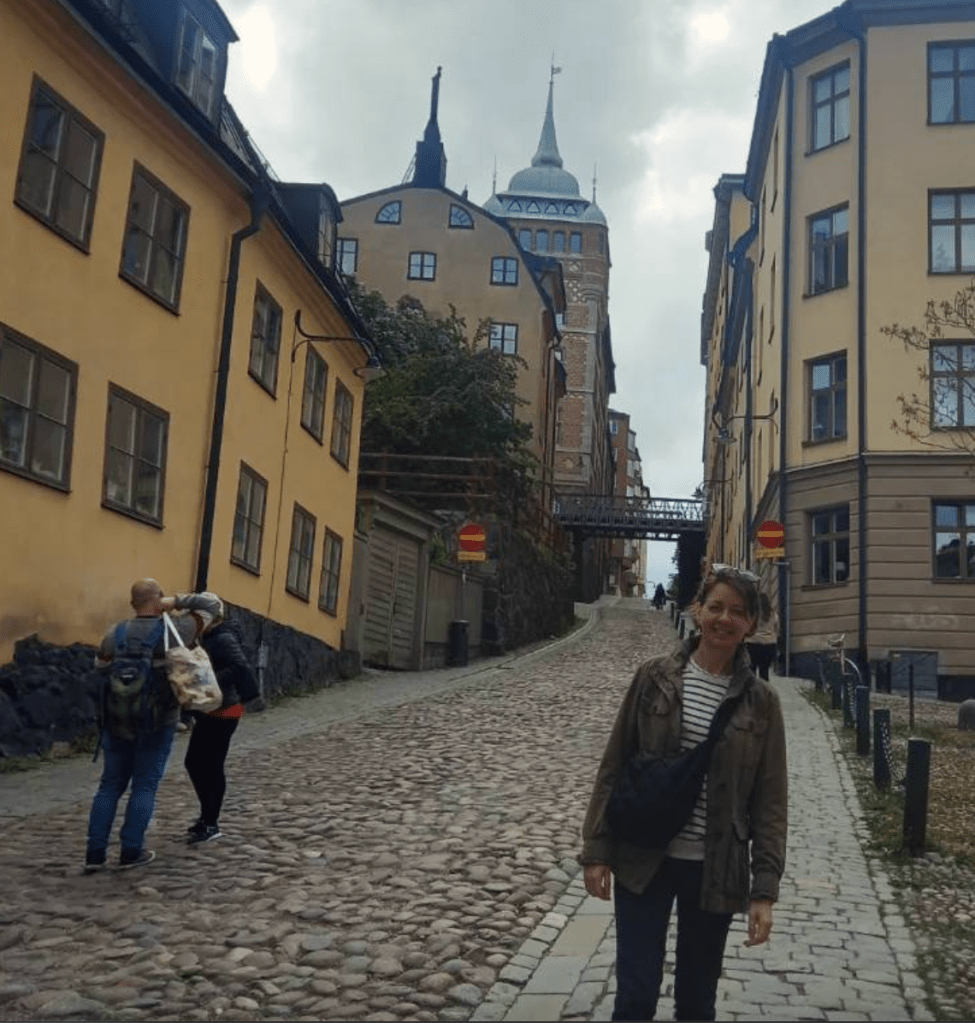 As my feet were a bit achy and I was hungry, I sat outside under the awning to await my fellow historical fiction writer and friend Kat from London Writers’ Salon, who had offered to take me to a few of her favourite places in Stockholm, including a bakery for some soup, wonderful GF bread and another fika cake. Had I not arranged to meet her, I might have tried to go to the Viking Museum, Nordic Museum or other museums on Museum Island, but at that point I was grateful to relax over a fika before heading up steep hills to a charming lilac-covered lookout point on trendy, arty Södermalm island, which offered a great panoramic view of the city. As the sun came out, we went via a charming, sculpture-filled park for drinks and chats at the Hotel Rival. Owned by ABBA’s Benny Andersson, it is one of the island’s many trendy boutique hotels with an art-deco cinematic feel and relaxing bar/bistro. There we discovered we had both worked for Incisive Media at some point in our careers.