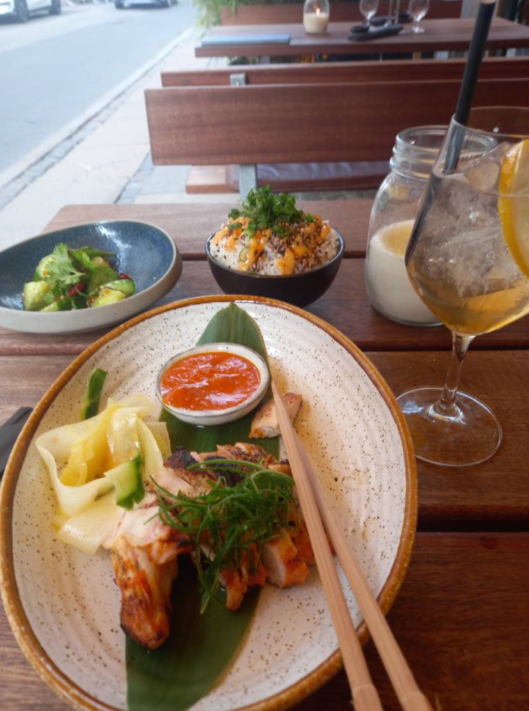 It being still a very nice, warm, sunny weather, I decided to walk to the end of the main pedestrianised walking/shopping street (Strøget), which runs through the old Mediaeval city and its Latin quarter (so called because of its former Latin-speaking affiliations), in the hopes of reaching the colourful Nyhavn harbour before sunset and getting some decent pictures. Along the way, I was distracted by an appealing-looking Pan-Asian restaurant (The Market Asian), which offered outdoor seating, so asked if they could do their cheaper (haha) taster menu as gluten-free, which they confirmed. While the food and saké-based cocktails were delicious and truly top-notch, I was quite shocked to find I’d been charged for the tap water, so between that and the supposed bank conversion surcharge, the meal was twice as expensive as I’d expected – okay, Copenhagen is famous for its innovative gastronomic cuisine, but as Steven said later, it was far too expensive, and I should have contested the tap-water charge. Had it not been for these two unexpected items on the bill, I would have given this place a 5* rating, but nearly £100 for a single meal is certainly OTT!