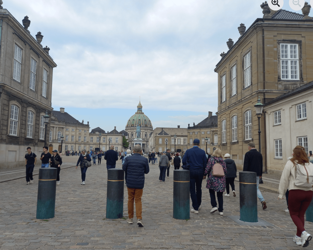 We then went by foot to the Amalienborg Palace, a series of royal residences arranged in a circle, where we were in time to watch the daily changing of guards at noon. After that, we headed to Nyhavn, where we dispersed to find lunch in a shady spot along the harbour as it was now full sun and hot. Since Anders had raved about Danish hotdogs, I decided to keep it cheap by buying a bread-less, bacon-wrapped one from a stand, adding plenty of mustard and washing it down with an Aperol Spritz. Anders said goodbye to us and we next boarded a canal boat for another tour – this time by water – of Copenhagen; while it was true we saw many of the same things, just from a different perspective, and the canal guide told us many of the same jokes Anders had done, she also memorably entertained us by bursting into song (mostly songs from famous musicals, though not the Danny Kaye one) every time the boat had to manoeuvre under yet another low bridge. (Apparently Danish tour guides must train for two years to get a guiding qualification, but it seems a perfect day job for supplementing artistic careers!)