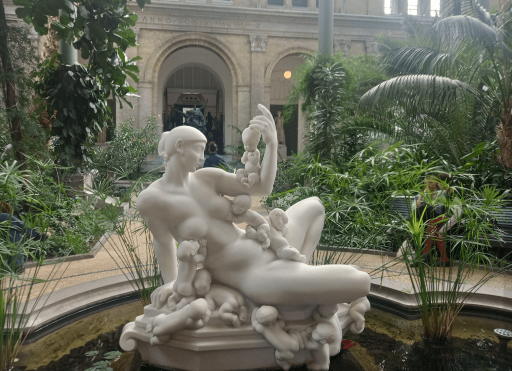 After the boat trip, we had a bit of free time to explore; I was determined to make it to the stunning NY Carlsberg Glyptotek Museum (Glyptoteket), which both guides had pointed out contained several important French Impressionist and other works from 1800–1930, with two additional exhibits on Degas and Gauguin. Although I had a bit of a walk and a very short time to get there, I did make it there for the last hour, so was able to see most of the major paintings, sculptures and artefacts that interested me, as well as enjoy a bit of time in its central botanical ‘winter’ garden. Sadly, the staff were a bit anxious to close ahead of the 5pm closing time so weren’t helpful in allowing me to use a toilet below**, but otherwise it was a great museum/gallery to visit, and I am glad I made the effort to get there.