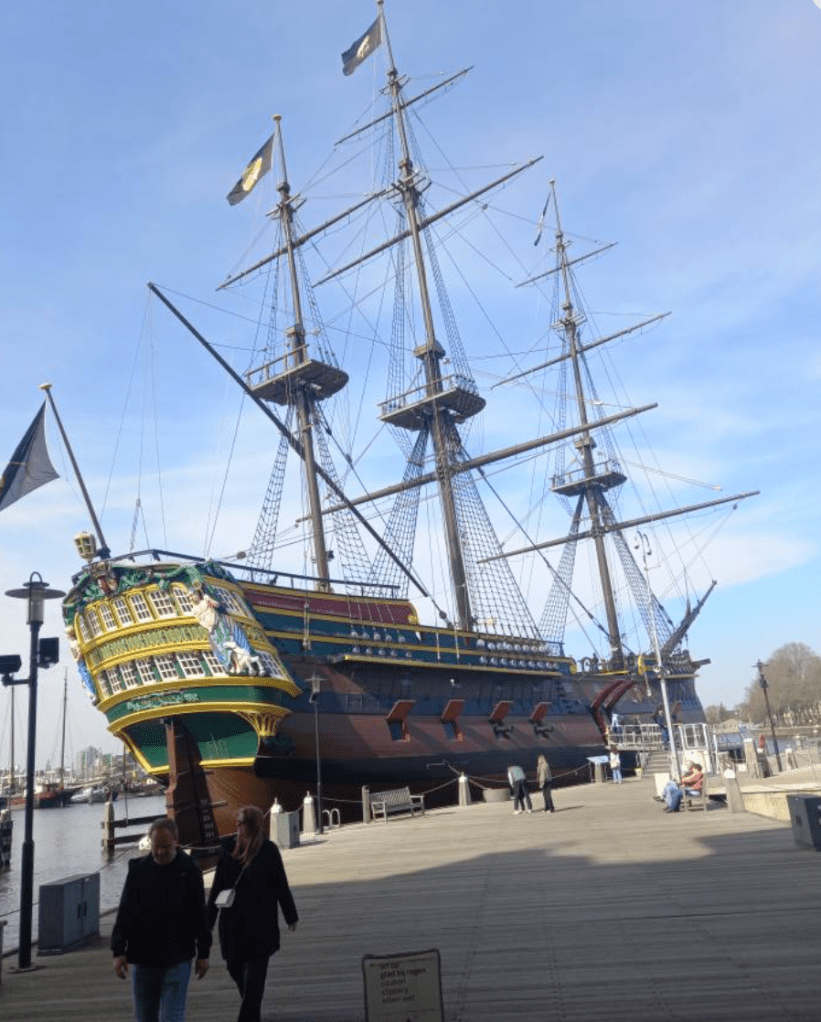 I next went to the inaugural Amsterdam Salsa Weekend in March, which I travelled to via Eurostar, with the plan of extending my trip to do some useful novel research by visiting relevant VOC (Vereenigde Oostindische Compagnie) sites in Amsterdam and Den Haag, including a trip to the Nationaal Archief headquarters and a wonderful visit with my dear friend Melanie exploring other cities (Utrecht, Scheveningin, Nordwijk, Delft), which I described in depth in a previous post. Although my main purpose was novel research – including going onboard a replica Dutch East Indiaman at Het Scheepvarthuis Museum (2025 was certainly a year for visiting ships!), visiting the VOC and other relevant sites in Amsterdam and the archives, etc – I also had a lot of fun dancing at the festival and Winkel von Sinkel in Utrecht and with friends old and new in Amsterdam.